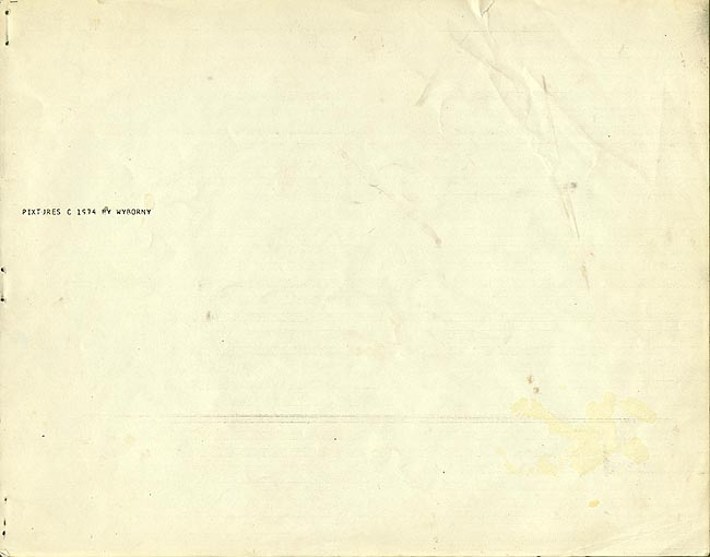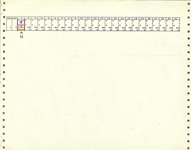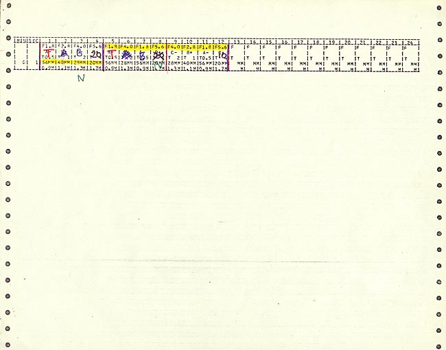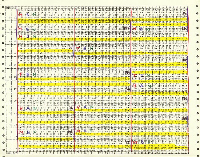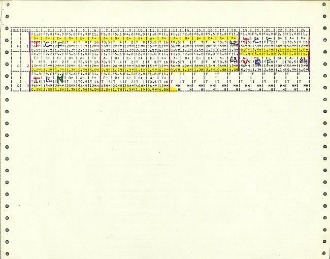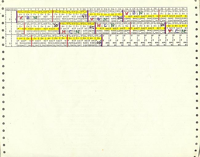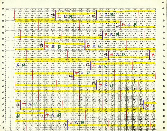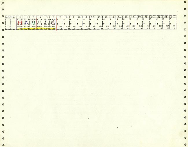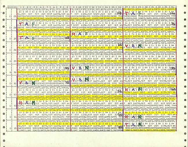 (Auf einem IBM-Großrechner und dazugehörigem Kettendrucker durch permutative Variation der grundsätzlichen Filmparameter wie Blende, Filterung, Belichtungszeit, Brennweite und Schärfe erzeugte Filmpartitur. Sie sollte einzelnen Filmmachern wie Paul Sharits, Ernie Gehr und Tony Conrad zugeschickt werden, um ihnen als Vorlage für Filme zu dienen, in denen jeweils einer dieser Grundparameter untersucht würde. Geplant war, diese einzelnen Filme zu einem einzigen mit dem Titel "Basic Motion Picture Analysis - Part One - Camera Parameters" zu versammeln. Die hier abgebildeten Seiten dienten als Vorlage für einen Film mit dem Titel "East of No West", der 1975 in New York und Puerto Rico aufgenommen, anschließend aber nicht fertiggestellt wurde. Die einzelnen Buchstaben beziehen sich auf Örtlichkeiten, Kamerabewegungen und verwendete Filmmaterialtypen, die Zahlen auf die zeitliche Länge der jeweiligen Sequenz, und die gelbe Spur durch die Partitur auf die Parameter, die an jeweils einer dieser Örtlichkeiten variiert worden sind. Die seinerzeit aufgenommenen Bilder sind in dem Film "Verwegen den Wellen entgegen" enthalten.)