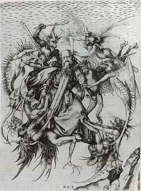 Auch in einem Kupferstich von Martin Schongauer von 1470: "Die Peinigung des Heiligen Antonius" können wir etwas davon erkennen. Um den in der Luft schwebenden heiligen Antonius bilden Dämonen und Ungeheuer eine Art Ring und zerren an ihm. Außerhalb dieses Rings sind unten Felsen angedeutet und oben durch Striche der Himmel, die beide durch die Linien des Rechtecks begrenzt werden. Sogar in dieser Karikatur von Perspektive gibt es dem Geschehen im Zentrum Raum und schottet es vom Bereich ihrer Unzulänglichkeit ab, hält also, wenn wir unserer Metapher weiter folgen, das Ende der Welt draußen. Interessant aber ist nun, daß die Ungeheuer vom Ende der Welt, die sich sonst erst in der Verzierungen der Holzrahmen finden, hier schon innerhalb des Bildes zu sehen sind: Sie bilden einen Rahmen innerhalb des Rahmens, der die gepeinigte Heiligkeit des Antonius umschließt. Es handelt sich um eine Darstellung der Angst vor dem Innenleben und die Rahmung besteht aus den Ungeheuern am Rande unseres Bewußtseins, die uns unsere Heiligkeit unmöglich machen wollen. Sie bilden eine Art perversen Heiligenschein um den Heiligen Antonius.