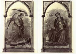 "hier guckt Maria den Engel direkt an, sie kann das tun, weil eine Säule direkt zwischen ihnen steht, normalerweise blickt sie im Halbprofil nach links ins Leere. Aber auch hier gibt es diese Raumtrennung. Das erinnert übrigens sehr an das Schuß-Gegenschuß-Verfahren im Film", fuhr er fort: "Ich habe beim Drehen meiner Schuß-Gegenschußpaare immer versucht, den Gesichtsausdruck von Maria genau in diesem Halbprofil hinzukriegen." "Sehr katholisch", sagte ich, "die Beschäftigung mit der unbefleckten Empfängnis, und das dann mit einer Begriffsbildung wie negatives Licht zu koppeln". "Tja", meinte er dazu, aber wenn ich mich für Geometrie interessierte, würde ich bestimmt die Säule zwischen dem Engel und Maria interessant finden. Oft wäre sie nur angedeutet, aber sie sei auf allen Verkündigungen vorhanden. Woher er das alles wisse, fragte ich, und ob er denn so viele studiert hätte. "Ja, für den Film", meinte er, und das mit der Säule wäre ganz bekannt. "Die Säule ist doch bestimmt der Penis Gottes", sagte ich, "den sie sich nicht anzublicken traut". "Nein, nein", sagte er unamüsiert, "so etwas liegt dem Denken von damals fern. Nein, der Literatur nach repräsentiert sie den heiligen Geist". "So, so, der heilige Geist also", meinte ich, "weißt du, daß ich selbst, wenn ich nur Landschaften photographiere, später immer sexuelle Untertöne in der Bildkomposition entdecke?" Oft wäre doch an gerade den einfachsten sexuellen Modellen in Bezug auf das Schöpferische was dran. "Nun, vielleicht", sagte er höflich, doch dann plötzlich mit erhöhter Intensität, "Nein, es ist der heilige Geist, you must believe me, Klaus, it is well known." Man sieht, auch so kann man sich näher kommen.