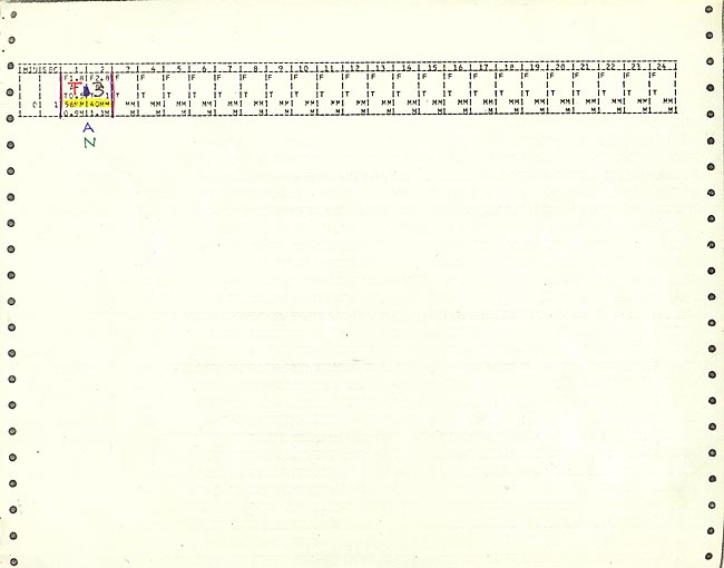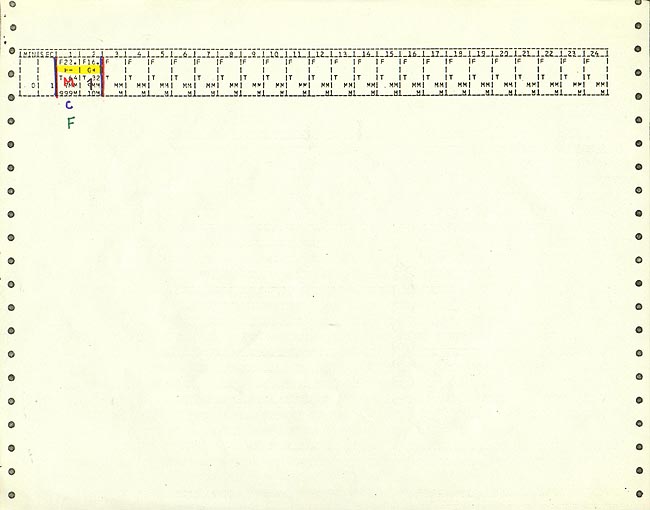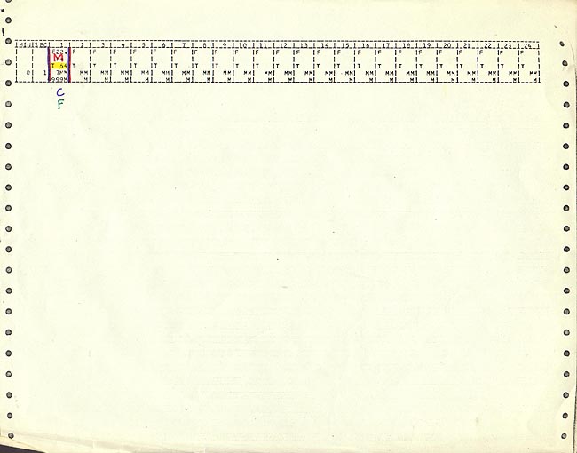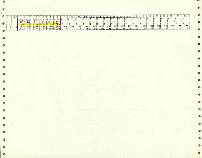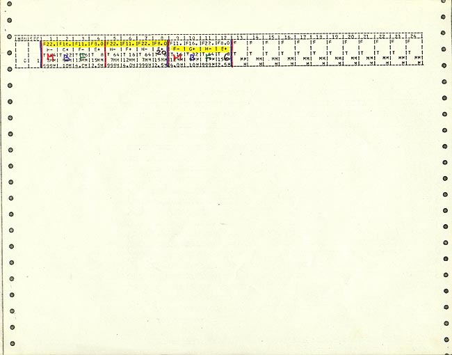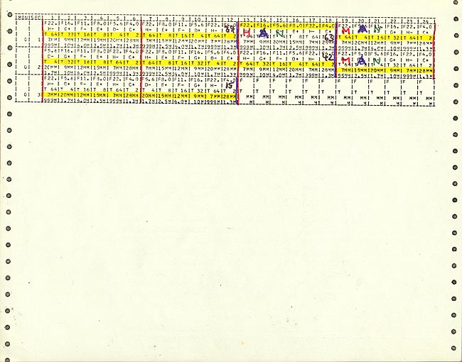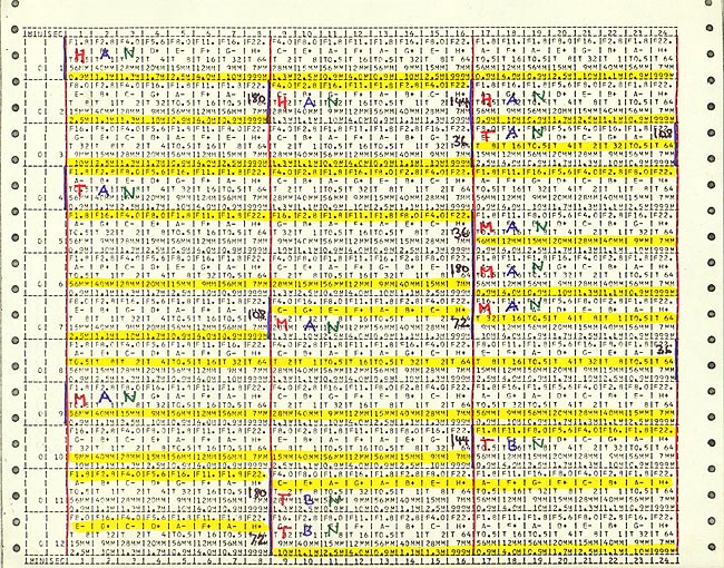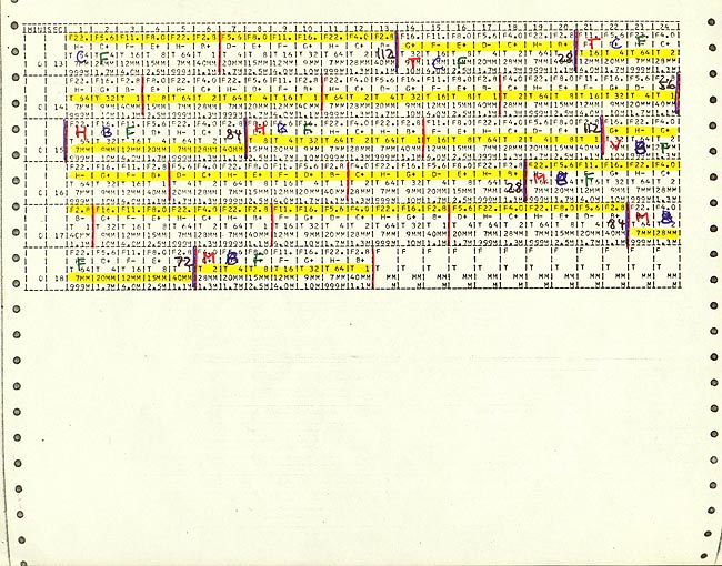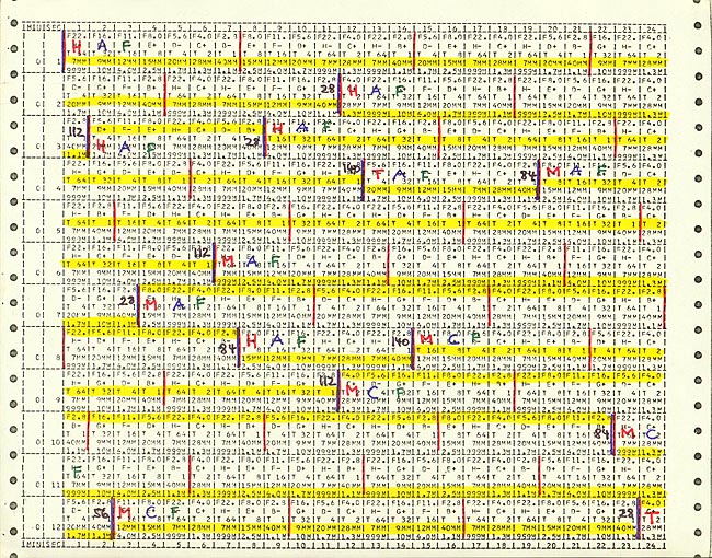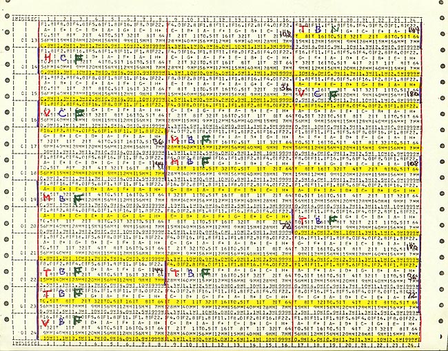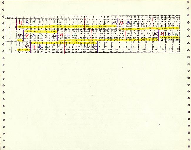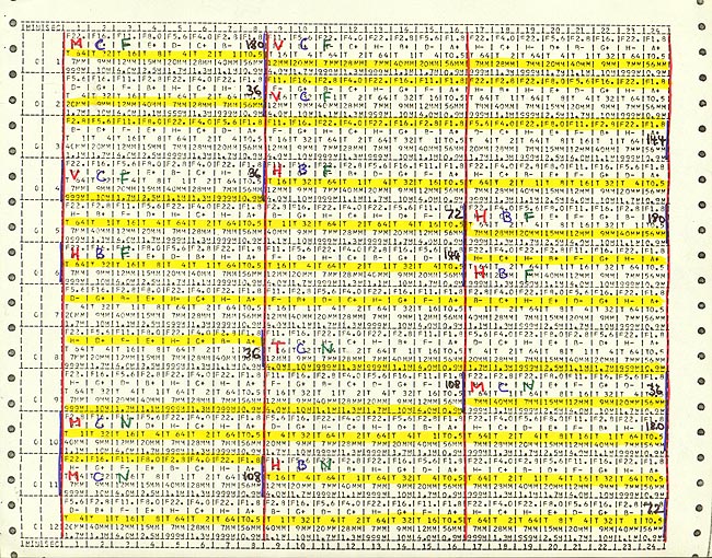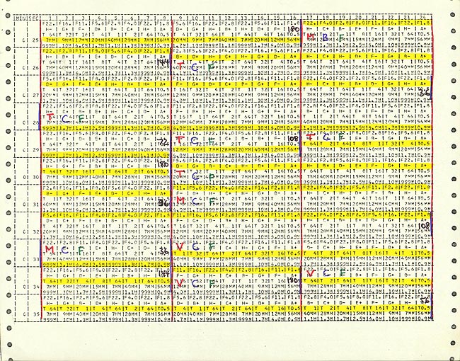 (Auf einem IBM-Großrechner und dazugehörigem Kettendrucker durch permutative Variation der grundsätzlichen Filmparameter wie Blende, Filterung, Belichtungszeit, Brennweite und Schärfe erzeugte Filmpartitur. Sie sollte einzelnen Filmmachern wie Paul Sharits, Ernie Gehr und Tony Conrad zugeschickt werden, um ihnen als Vorlage für Filme zu dienen, in denen jeweils einer dieser Grundparameter untersucht würde. Geplant war, diese einzelnen Filme zu einem einzigen mit dem Titel "Basic Motion Picture Analysis - Part One - Camera Parameters" zu versammeln. Die hier abgebildeten Seiten dienten als Vorlage für einen Film mit dem Titel "East of No West", der 1975 in New York und Puerto Rico aufgenommen, anschließend aber nicht fertiggestellt wurde. Die einzelnen Buchstaben beziehen sich auf Örtlichkeiten, Kamerabewegungen und verwendete Filmmaterialtypen, die Zahlen auf die zeitliche Länge der jeweiligen Sequenz, und die gelbe Spur durch die Partitur auf die Parameter, die an jeweils einer dieser Örtlichkeiten variiert worden sind. Die seinerzeit aufgenommenen Bilder sind in dem Film "Verwegen den Wellen entgegen" enthalten.)